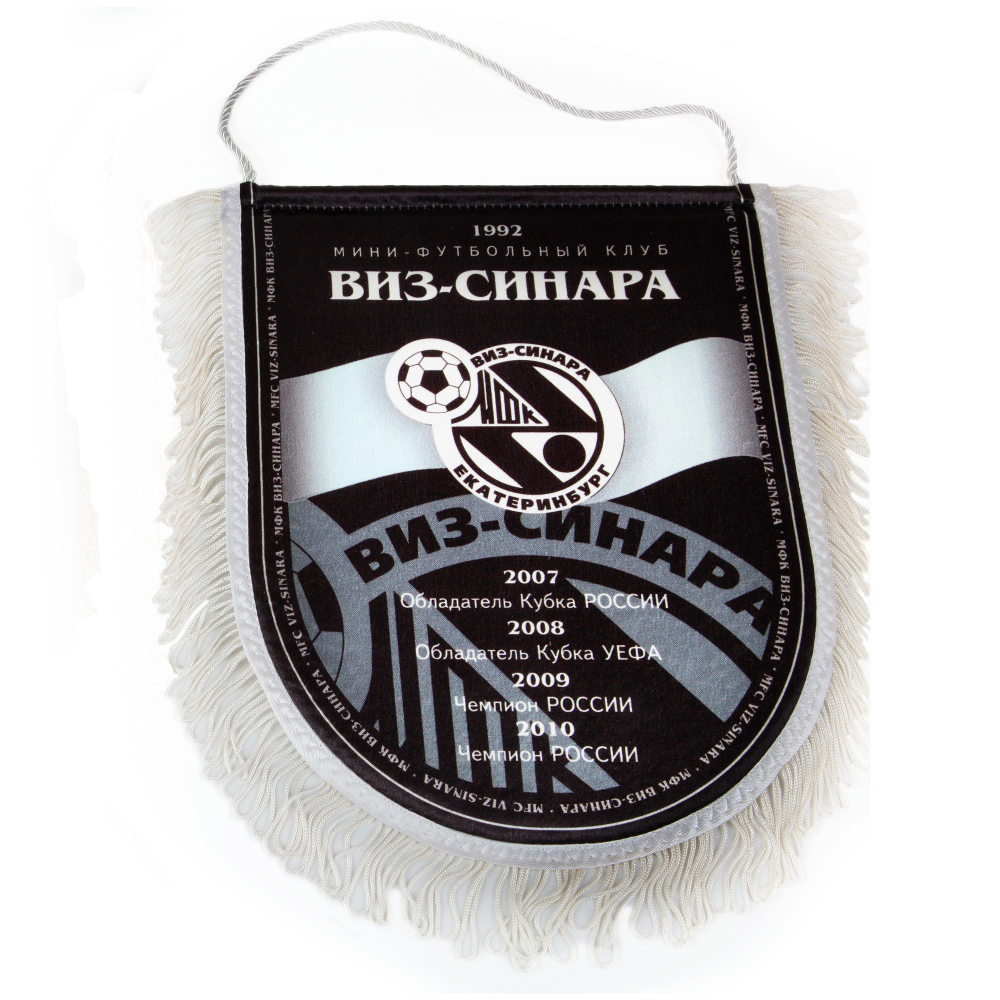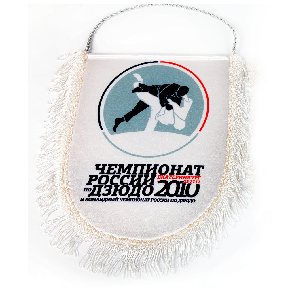 Печатный вымпел изготавливается из крепсатина, имеет основу из картона для придания жесткости, обшивается бахромой.