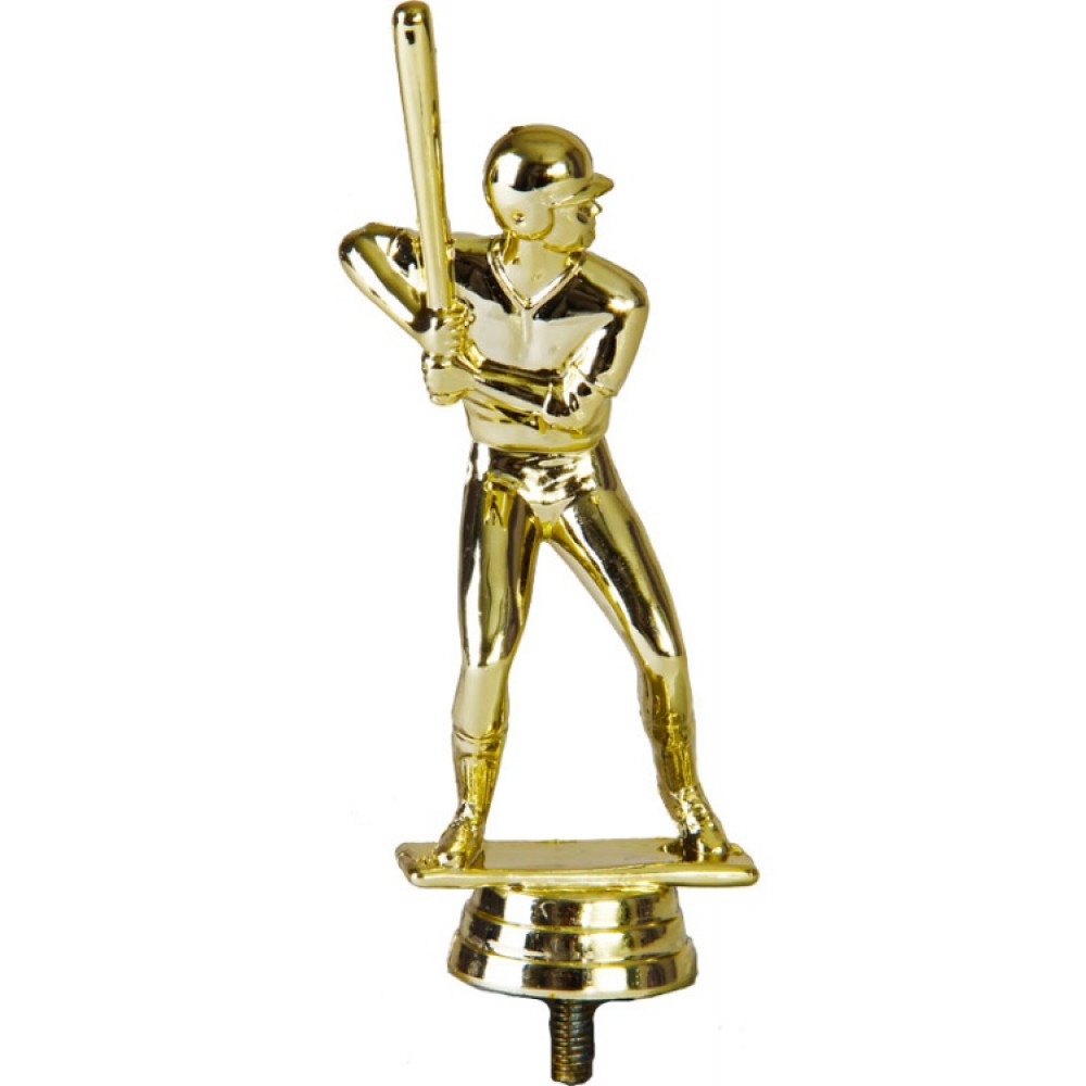Цвет: золото, материал: пластик. Вид спорта: бейсбол. Фигурка выполнена в виде мужчины. Локти широко расставлены в сторону, в руках зажата бейсбольная бита. Голова игрока повёрнута к цели. На голове – шлем. Ноги согнуты в коленях и широко расставлены в стороны. Бейсболист находится на тонкой прямоугольной пластине – имитации бейсбольного поля. Ниже - круглое основание, на котором имеются горизонтальные линии. Высота, см: 12.7 Вес, кг: 0.047. Фигурку возможно закрепить на цоколь, постамент или кубок.