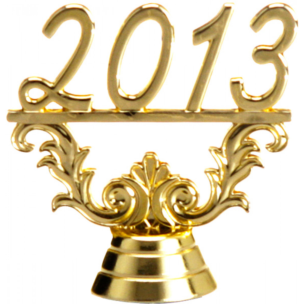 Фигурка пластиковая "2013". Цвет золото. Высота 5 см. Представляет собой цифры с курсивным шрифтом, расположенные на узорном элементе в виде растительного рельефа. Фигурка установлена на стеме в виде небольшого элемента конусообразной формы. Фигурку возможно закрепить на цоколь, постамент или кубок.