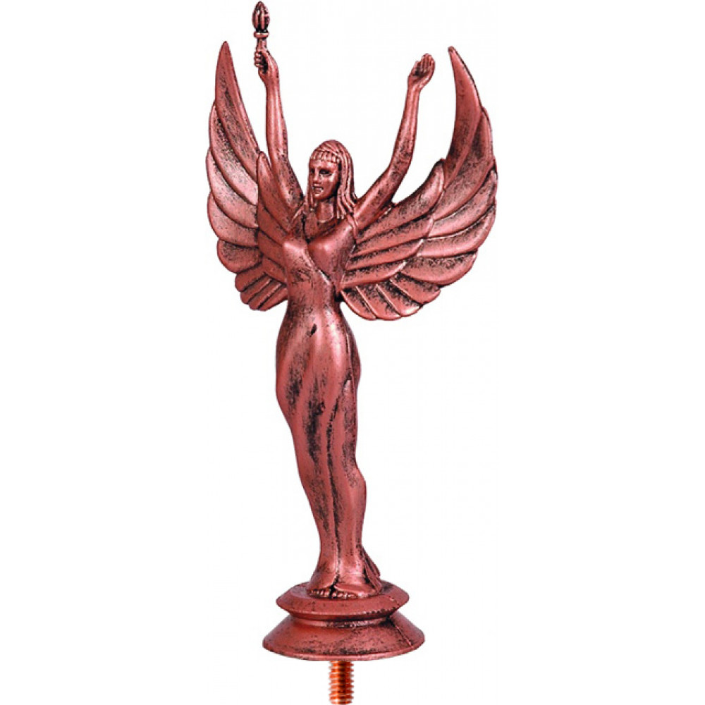 Фигурка пластиковая "Ника". Высота 14 см. Представлена в трех цветах: золото, серебро, бронза. Фигурка представляет из себя женщину с поднятыми вверх руками. Женщина имеет четкие очертания талии и груди. Правая рука держит небольшой факел, руки немного согнуты в локтях, будто расслаблены. Волосы до плеч, распущены. Одета в длинное платье с коротким рукавом, платье свободно струится по телу, из под платья видны кончики пальцев на ногах. За спиной у женщины расположены крылья. Высота крыльев схожа с высотой поднятых вверх рук. Концы крыльев заостренные. Женщина имеет славянские черты лица. Фигура установлена на небольшой подставке круглой формы. Фигурку возможно закрепить на цоколь, постамент или кубок.