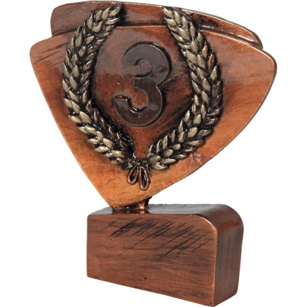 Фигурка литая "3 место". Цвет бронза. Высота 11 см. Представляет собой треугольник со скругленными углами и сторонами, установленный на прямоугольную подставку. По центру треугольника изображены рельефные лавровые ветви в форме подковы. Между ветвей расположена цифра "3".