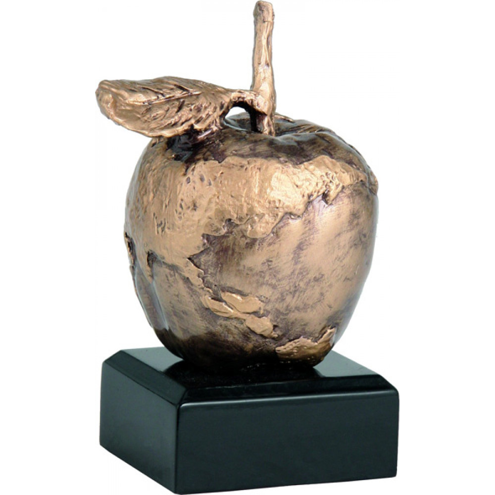 Фигурка литая "Экология". Цвет бронза. Материал: пластик. Высота 14 см. Изображено яблоко с веточкой и листочком. Поверхность яблока неоднородная. Фигурка установлена на цоколе в форме квадрата, цвет черный.