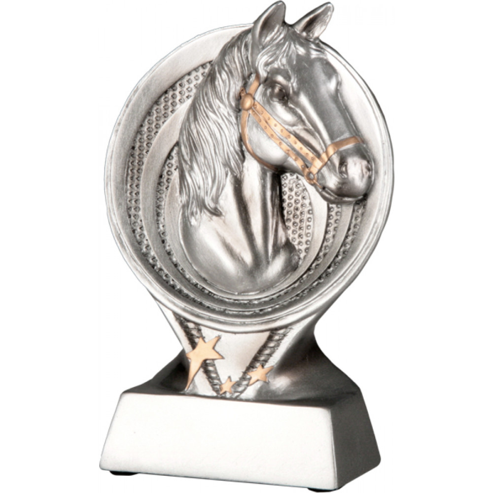 Фигурка литая "Лошадь". Материал пластик, цвет серебро. Высота 15,5 см.¶Фигурка представляет из себя круг, внутри которого изображены две окружности друг в друге, фон в виде частых мелких точек. В центре круга изображена голова лошади в уздечке золотого цвета. В верхней части фигуры образ лошади выступает за область круга. Под кругом изображен элемент в форме треугольника с тремя звездами золотого цвета и вдавленным ребристым элементом в форме буквы "V". В нижней части фигуры, под треугольником, изображен цоколь в форме горизонтального четырехугольника. Место под эмблему 60 * 20 мм.
