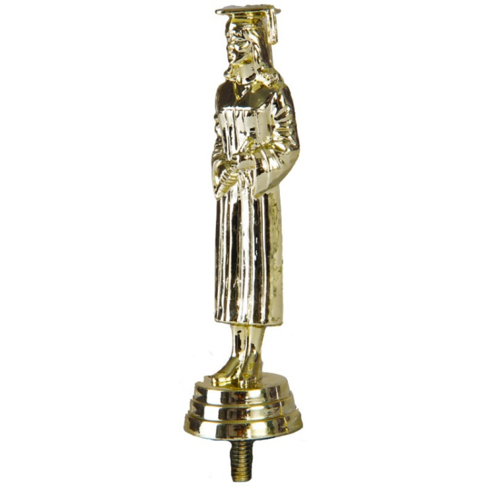Цвет: золото, материал: пластик. Тема: образование. Фигурка выполнена в виде женщины, одетой в мантию и колпак, который вручают выпускникам университета. Ноги стоят вместе. На ногах классические туфли. Женщина находится на круглом основание, на котором имеются горизонтальные линии. Высота, см: 12.7. Фигурку можно закрепить на цоколь, постамент или кубок.