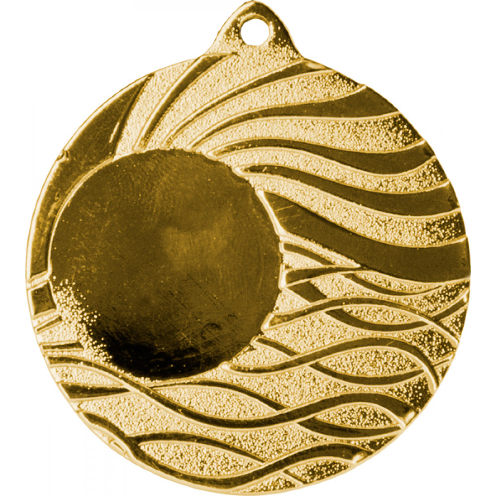 Медаль металлическая, круглой формы. Диаметр 50 мм, толщина 3 мм.¶Цвет медали, имитирующий золото/серебро/бронзу.¶Сверху расположено округлое ушко для крепления ленты.¶В центральной левой части лицевой стороны медали расположено место под вкладку, диаметр 25 мм. В нижней части медали расположены переплетающиеся выпуклые гладкие линии в количестве 8 штук, в верхней части так же расположены линии в форме волн, не переплетающиеся, в количестве 8 штук.¶На медали нет никаких других изображений, нет рисунков, относящихся к конкретному виду спорта.