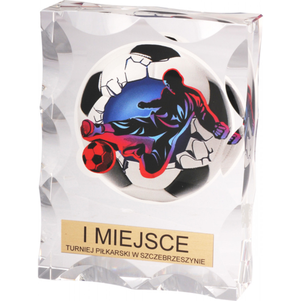 Награда стеклянная "Футбол". Прозрачная. Толщина стекла 30 мм. Представляет собой вертикально расположенный прямоугольник, по краю фигуры нанесены срезы в виде полукругов. На вертикальных сторонах по 3 среза, на горизонтальных- по 2.¶На задней части награды нанесено изображение футбольного мяча, в центре которого изображен футболист, в прыжке совершающий удар по мячу. Цвет изображения черно-сине-красный. В нижней части фигуры возможно нанесение персонализации на металлическом шильде, либо шильде из металлизированной пленки.